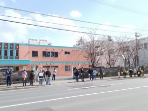 手作りの旗やポスターを手に、行き交う車に向かって「安全運転お願いします。」と呼びかけ地域の交通安全に貢献しました。